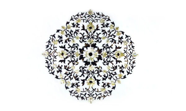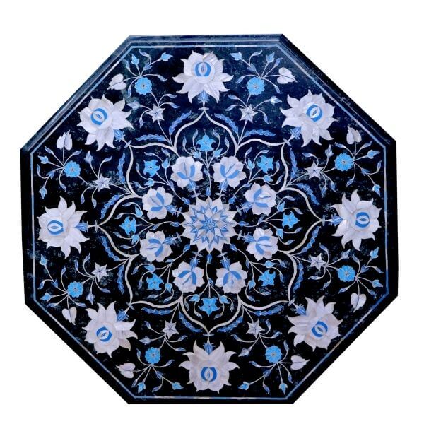 A marble inlay octagonal table top is a stunning example of traditional craftsmanship and timeless elegance. Shaped in a unique eight-sided form, this table top features intricate inlay work crafted by skilled artisans using semi-precious stones like lapis lazuli, malachite, mother-of-pearl, and jasper. The detailed patterns—often floral, geometric, or Mughal-inspired—are carefully set into the marble surface, creating a visually captivating centerpiece. Ideal for both decorative and functional use, the octagonal shape adds a distinctive architectural element that stands out in any space. Durable and luxurious, this table top is perfect for use in coffee tables, accent tables, or as a standalone decorative piece.